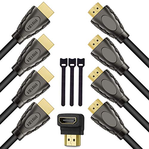 - ✅ PACKAGE INCLUDES - 4 x 3 feet HDMI cables, 1 x Right angle 90° adapter, 3 x 6 inch Resealable Cable ties, 1-year warranty.